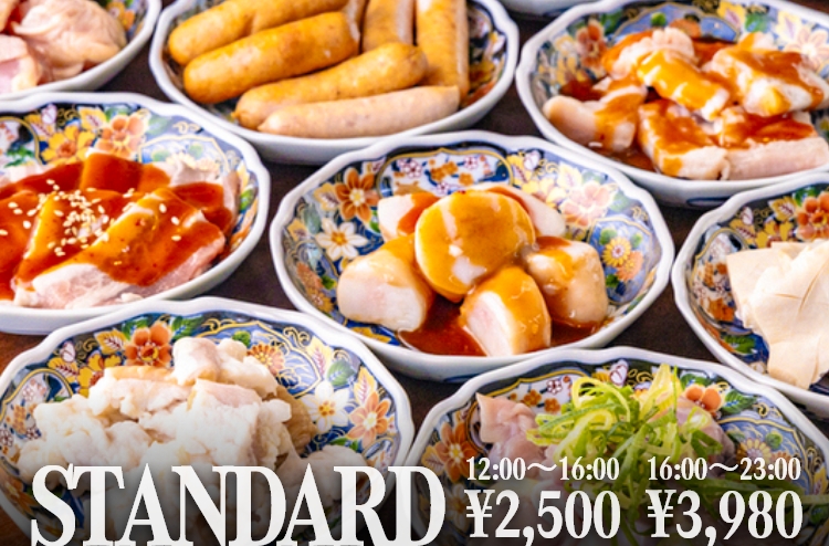 ハラミやカルビが集結!和牛も入った全100品が食べ放題!和牛を含む内容ながら、価格はなんと3,980円 (税込)ランチタイムは2,500円 (税込)と圧倒的コスパ。鶏・豚・ホルモン・野菜・ごはん・デザートまでバランス良く揃った、迷ったらコレな定番コースです。