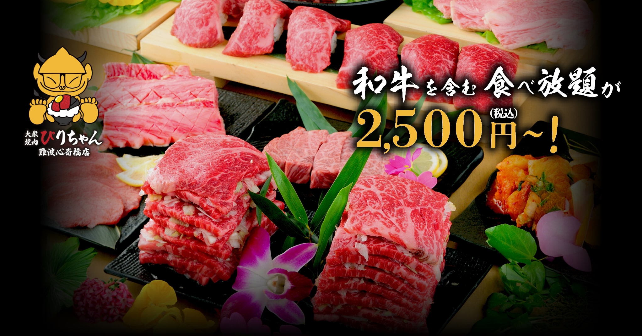 和牛を含むワンランク上の食べ放題が楽しめる「大衆焼肉びりちゃん 難波・心斎橋店」。サイドメニューも充実の全100品以上が、2,500円(税込)〜ご提供。店内には2名様から使える完全個室・半個室を完備。なんば・心斎橋エリアで贅沢な焼肉を気軽に楽しむなら、ぜひ当店へ!